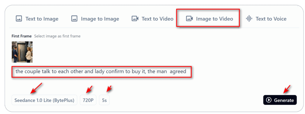 You’ll find multiple features: Text to Image, Image to Image, Text to Video, Image to Video, and Text to Voice.